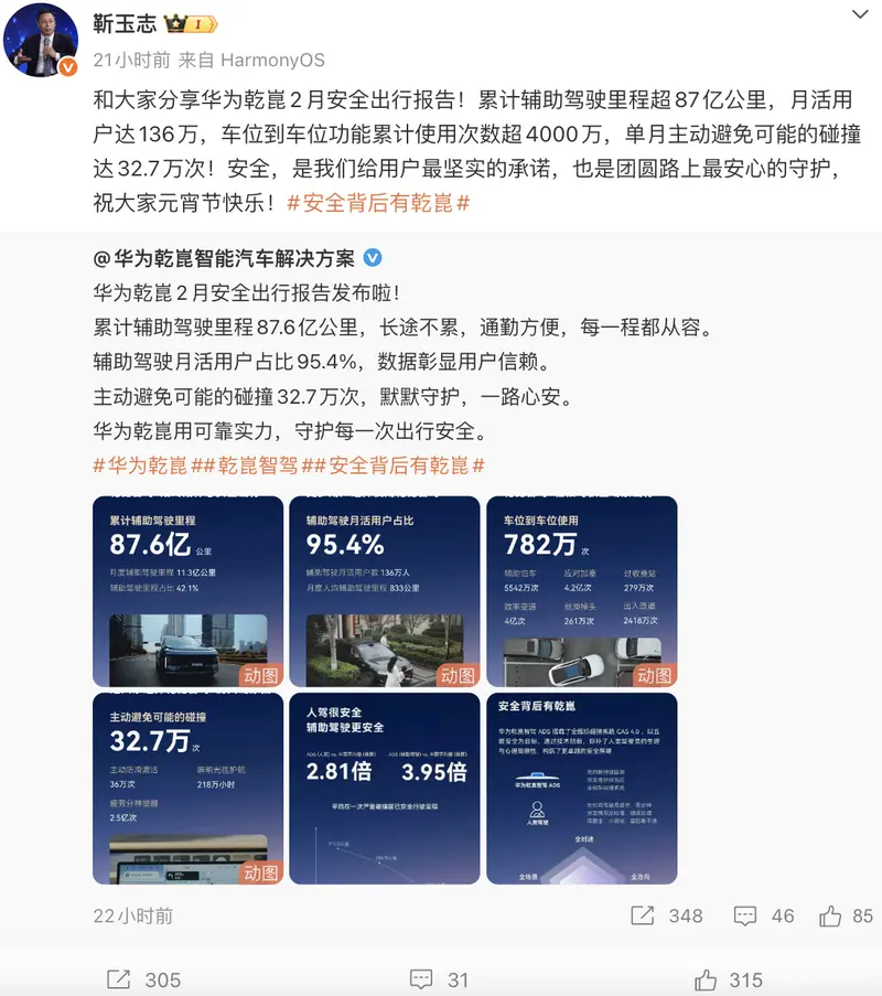 易车讯 日前,华为 智能汽车解决方案BU CEO靳玉志分享了华为乾崑2月安全出行报告。累计辅助驾驶里程超87.6亿公里,月活用户达136万,车位到车位功能累计使用次数超4000万,单月主动避免可能的碰撞达32.7万次。
