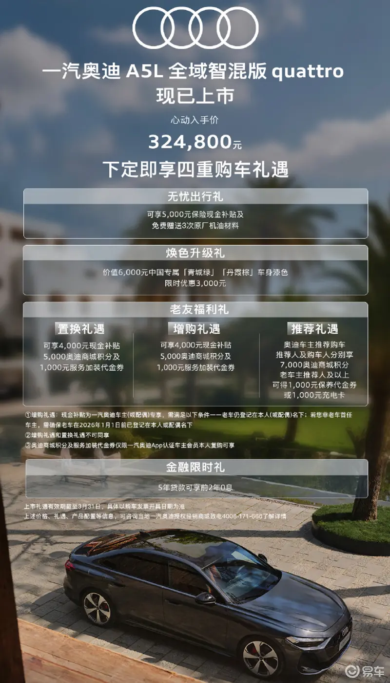 一汽奥迪A5L全域智混版quattro上市权益同步开启。用户在2026年3月31日前下定核销且开票,可享5,000元保险补贴;限时3,000元可享价值6,000元高定专属流光漆色;奥迪车主增购、置换,可享现金等专属礼遇。此外,还有金融限时礼,5年贷款享前2年0息。