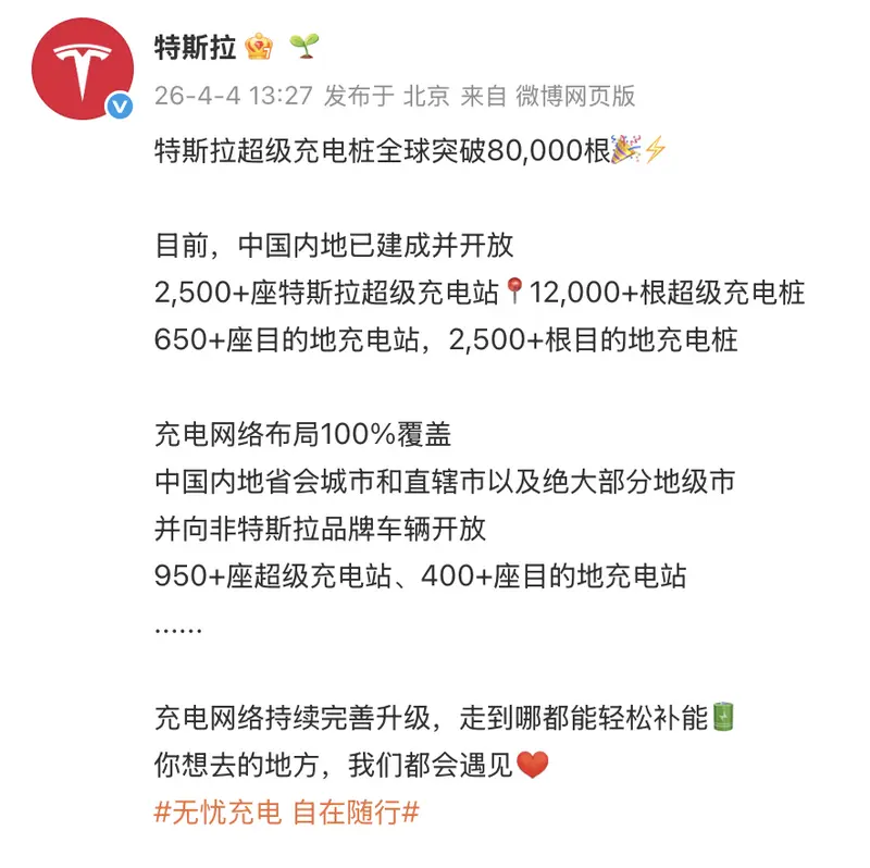 我们从相关渠道获悉。2026年第一季度充电网络总输出电量达1.8太瓦时,同比增长22%,2025年全年输电更是达到6.7太瓦时,可支撑超过447亿公里的行驶里程。按照规划,2026年底全球超级充电桩目标将突破10万根,其中中国市场计划再新增5000根,同时继续扩大开放范围,预计年底开放超1200座超充站。