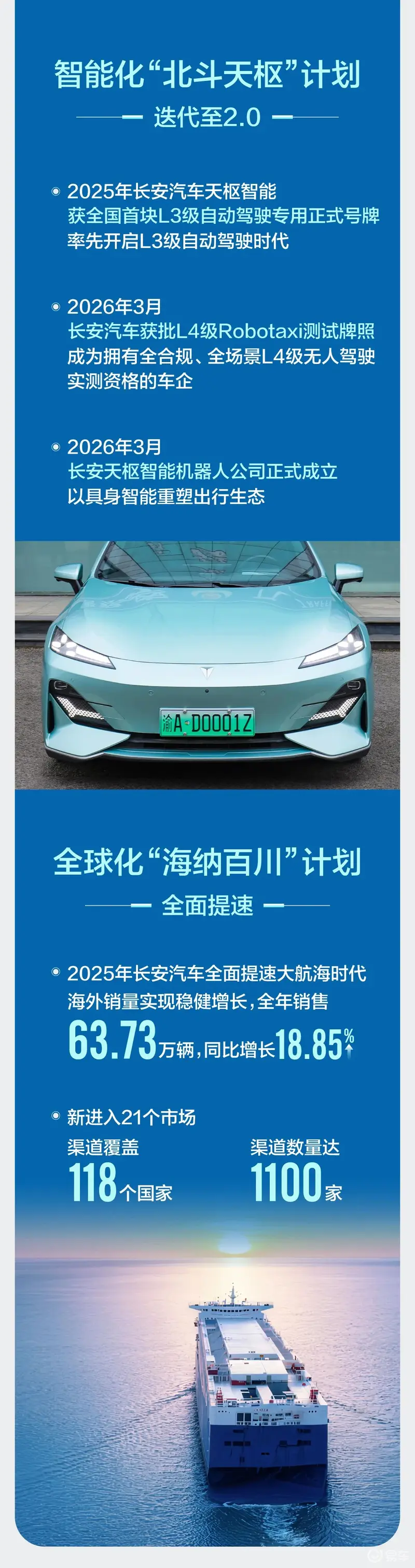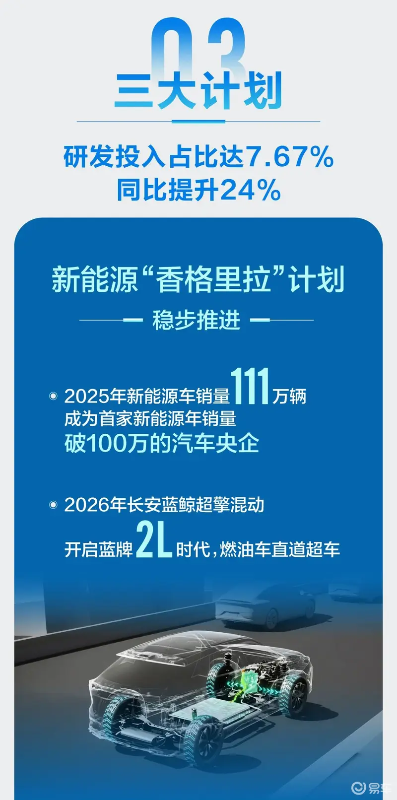 2025年,长安汽车全年研发投入125.76亿元,占营收比超7.67%,同比提升24%。新能源"香格里拉"计划,稳步推进,2026年长安蓝鲸超擎混动开启2L时代,燃油车直道超车开启蓝牌。智能化"北斗天枢"计划,迭代至2.0。全球化"海纳百川"计划,全面提速 ,新进入21个市场渠道,覆盖118个国家,渠道数量达1100家。