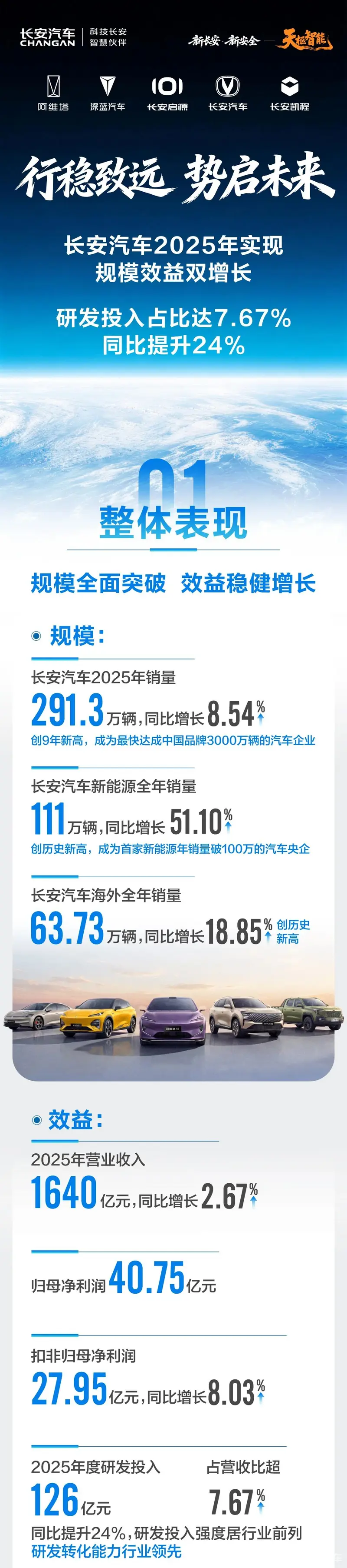 易车讯 日前,长安汽车公布了2025年经营情况。2025年实现规模效益双增长,营业收入1640亿元,同比增长2.67,研发投入占比达7.67%,同比提升24%。长安汽车2025年销量291.3万辆,同比增长8.54%,创9年新高。新能源全年销量111万辆,同比增长51.10%,海外全年销量63.73万辆,同比增长18.85%,均创历史新高。