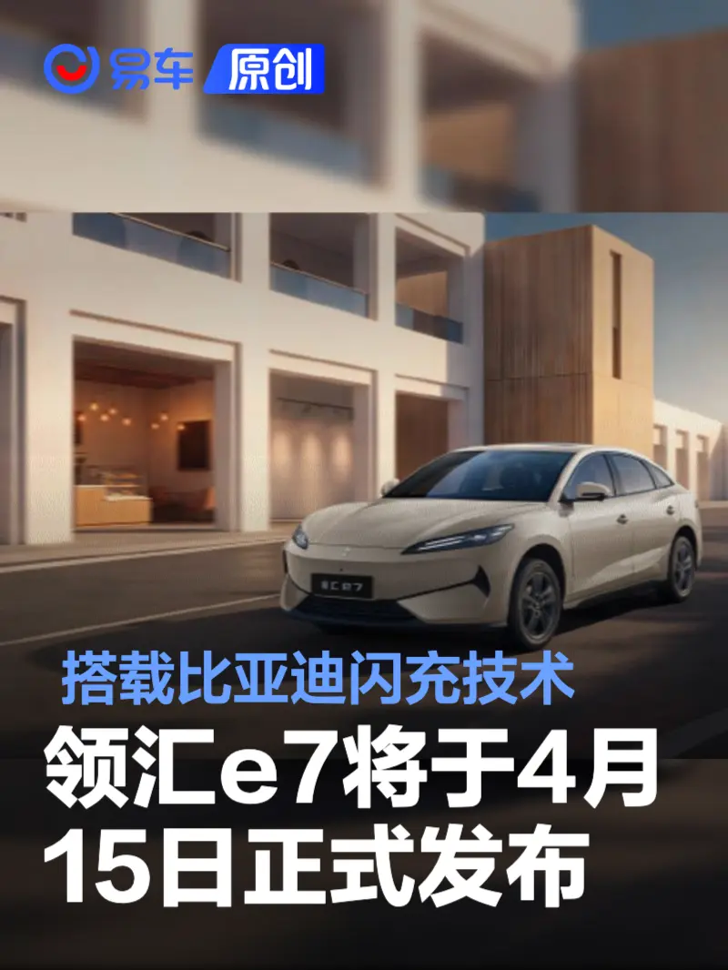 易车讯 4月11日,我们从领汇汽车获悉,比亚迪全新汽车品牌领汇汽车旗下首款大空间闪充中级纯电轿车领汇e7将于4月15日正式发布。新车将搭载比亚迪闪充技术 ,可实现5分钟充好、9分钟充饱的快充体验。