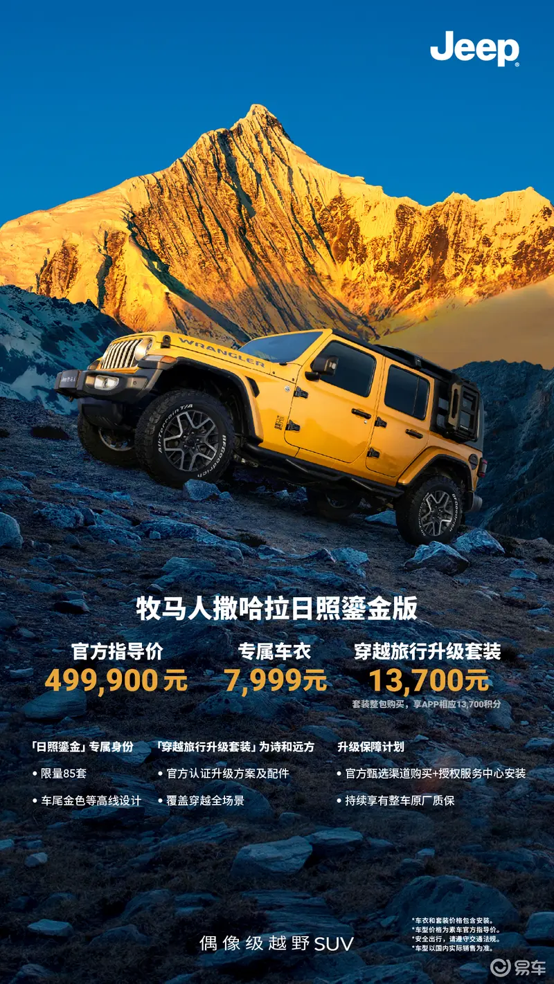 牧马人撒哈拉日照鎏金版,官方指导价49.99万元,并推出牧马人撒哈拉日照鎏金专属车衣和穿越旅行升级套装,专属车衣定价7,999元,限量85套,即日起在Jeep Life商城上线。面向穿越与露营场景的穿越旅行升级配件包定价13,700元,即日起在Jeep APP精品商城上线,整包购买可获得相应Jeep APP积分。