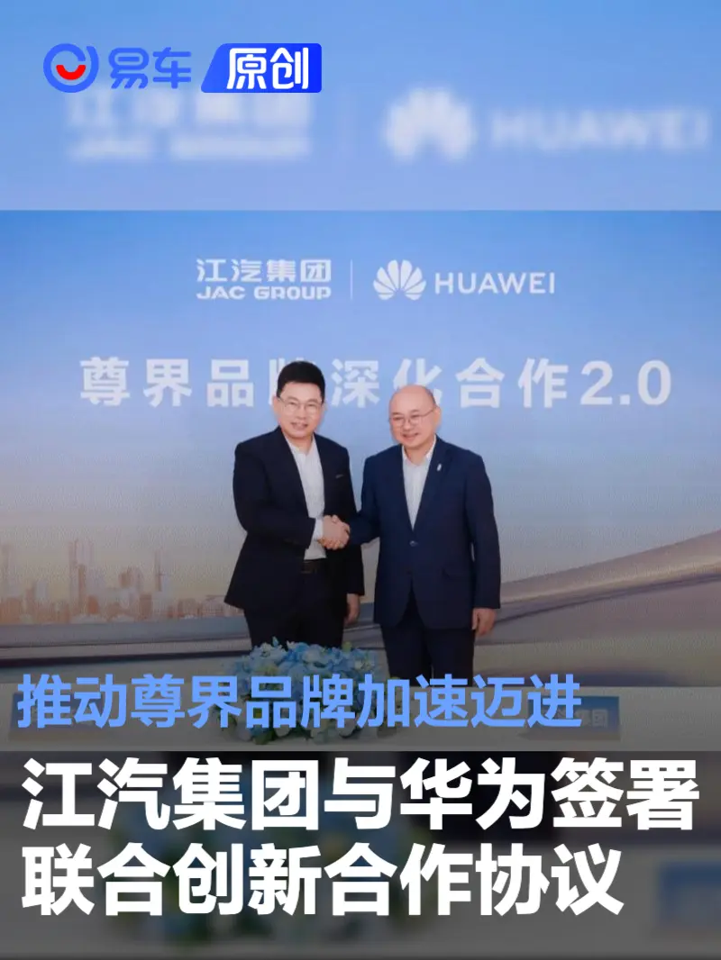 易车讯 4月26日,安徽江淮汽车集团股份有限公司与华为终端有限公司在北京正式签署《联合创新合作协议》。此次签约标志着双方战略合作进入全面纵深阶段,将以技术共研、产业链共融、品牌共塑为核心,推动尊界品牌向中国超豪华智能汽车引领者加速迈进。