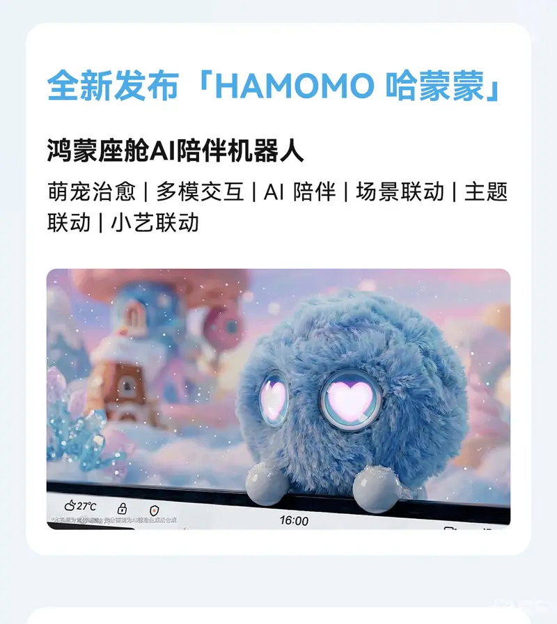 南向生态:智能拓展覆盖10+品类,体验全面拉满;并基于AI多模态感知系统(AMS)和指向性遥控器,行业首发车载体感游戏,带来创新交互新玩法。同时首发小艺新伙伴-AI陪伴机器人 “哈蒙蒙-HAMOMO”,丰富灵动表情,可互动、会卖萌,既是小艺的亲密搭档,也是用户的趣味出行伙伴。