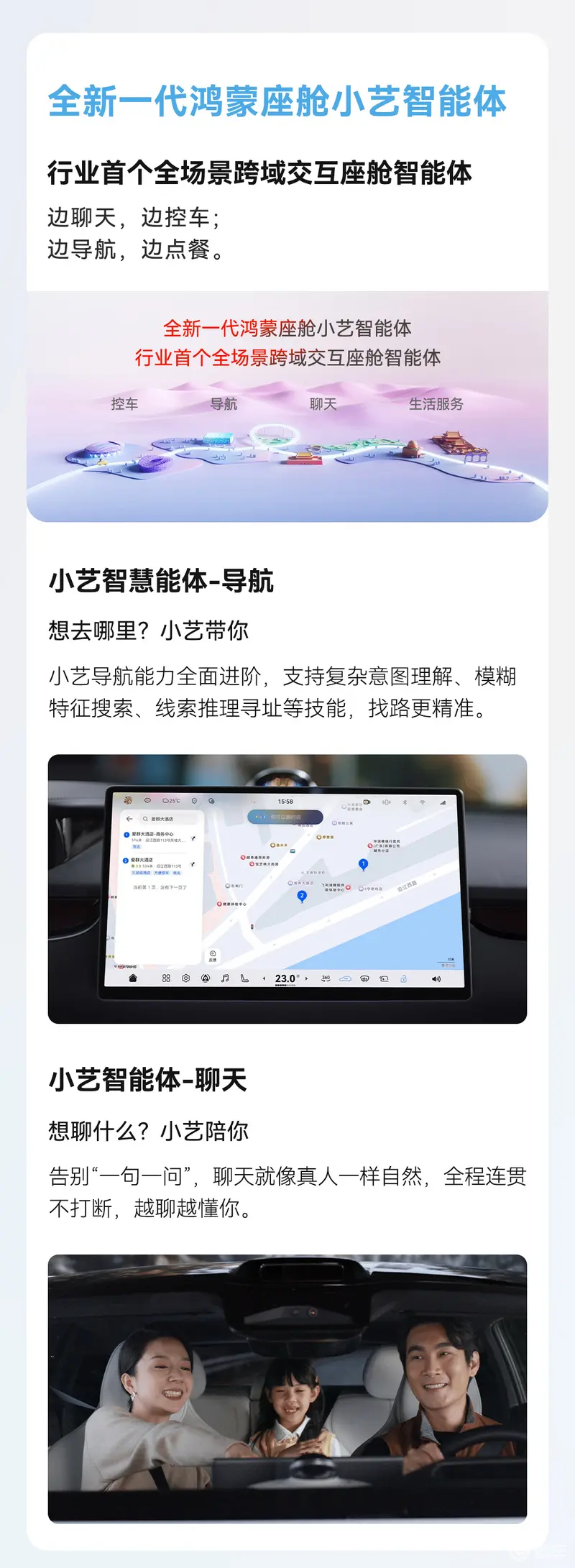 AI Agent 生态:首批上线出行、影音娱乐、生活服务类智能应用,深度联动鸿蒙座舱小艺智能体,实现用户需求一语直达、一站式智能响应。