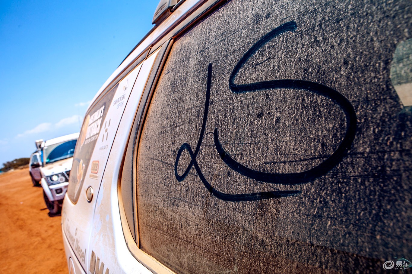 某个调皮的队友在我们车窗上写了个“Hi!”而且写的是反的,我们从车里才能看出来。大家都被激发了想象力在车身上尽情创作,我这么没创意又自恋的家伙,先签个姓名缩写再说。