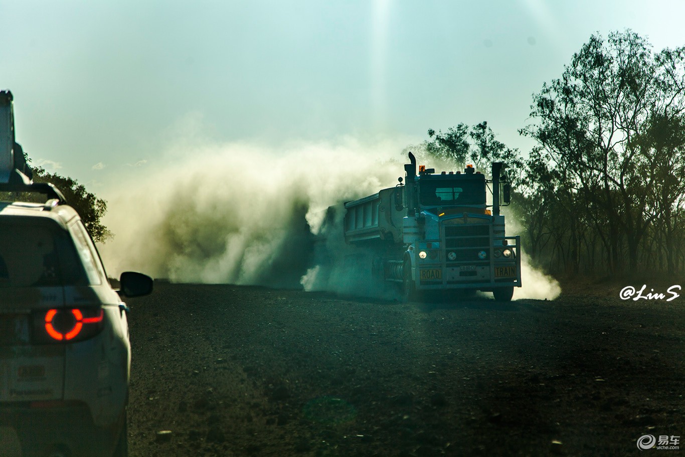 这是澳洲特有的超长卡车,一个车头连续拖着三四节油罐,像火车一样长。经过的时候群车闪避,带着滚滚风尘呼啸而去,留着我们在尘土里凌乱好一会儿才能继续向前。这绝对算澳洲的特产,能把卡车造如此之长。
