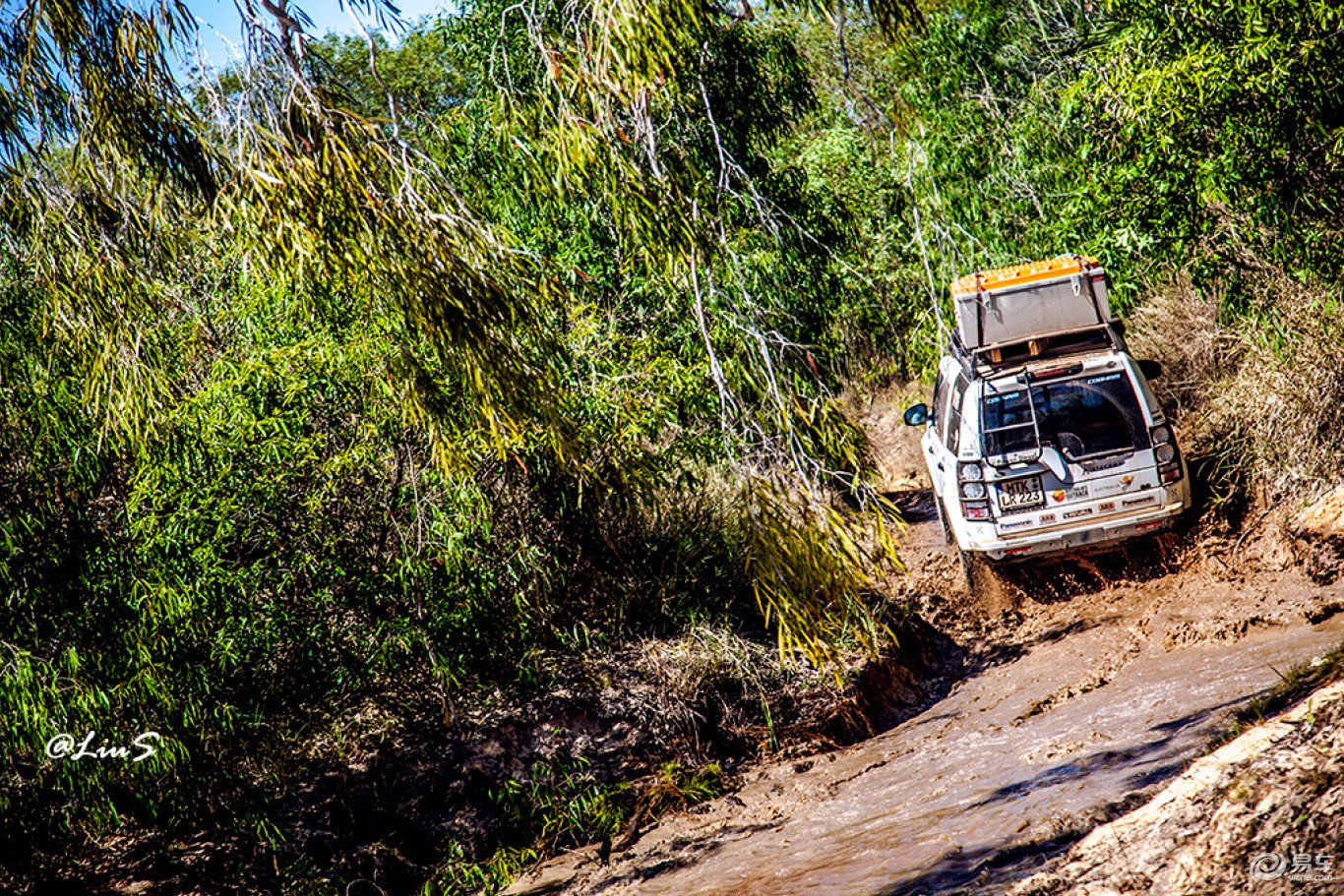 卡车之后,发现跟随。过河之后的上坡不太好走,湿滑而不平,容易磕到底盘,要小心选路。