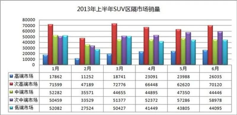 从顾客群体的产品选择标准、消费需求形态、消费行为模式等角度考量,SUV市场以品牌车型的指导起步价为向量,已经裂变为5个区隔性市场。