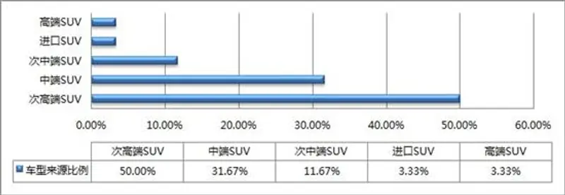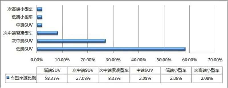 从竞争车型来源的角度考察,次中端车型呈现出两个强烈的特征:第一,顾客人群在车型类别的选择视野上,表现出比较显著的的向心倾向。这主要表现在SUV的车型来源比例合计高达96.66%。第二,顾客人群在车型选择上,明显地呈现出注重功能性利益和性价比优势的利益趋向。这主要表现在低端和次中端两个档次车型的比例合计高达76.67%。