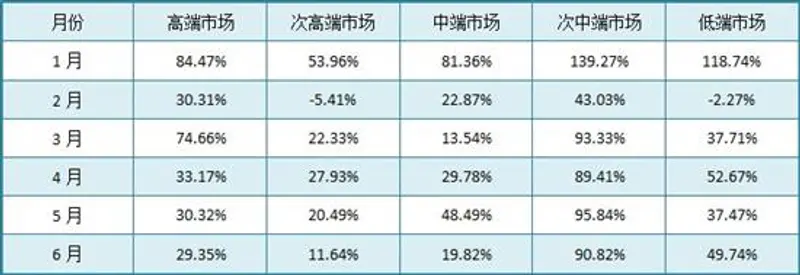 从销售同比上看,SUV所有的档次区隔市场都呈现出同比销量正向增长的态势。其中,次中端市场的增长幅度和速度最为强烈和高亢。高端、中端和低端市场呈现出跳跃式增长态势。而次高端市场的同比增长幅度和速度表现出稳定与冷静的态势。