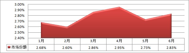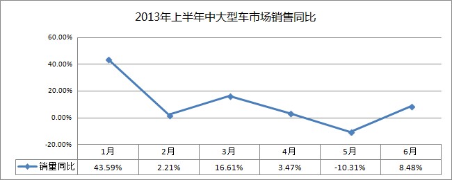 从销售份额可以看出:今年上半年,中大型车的市场份额在震荡中呈现出小幅增长态势。在4月份,艰难地回归到了去年的平均水平。5、6月份这个业绩没有保持住,份额又有所下跌。