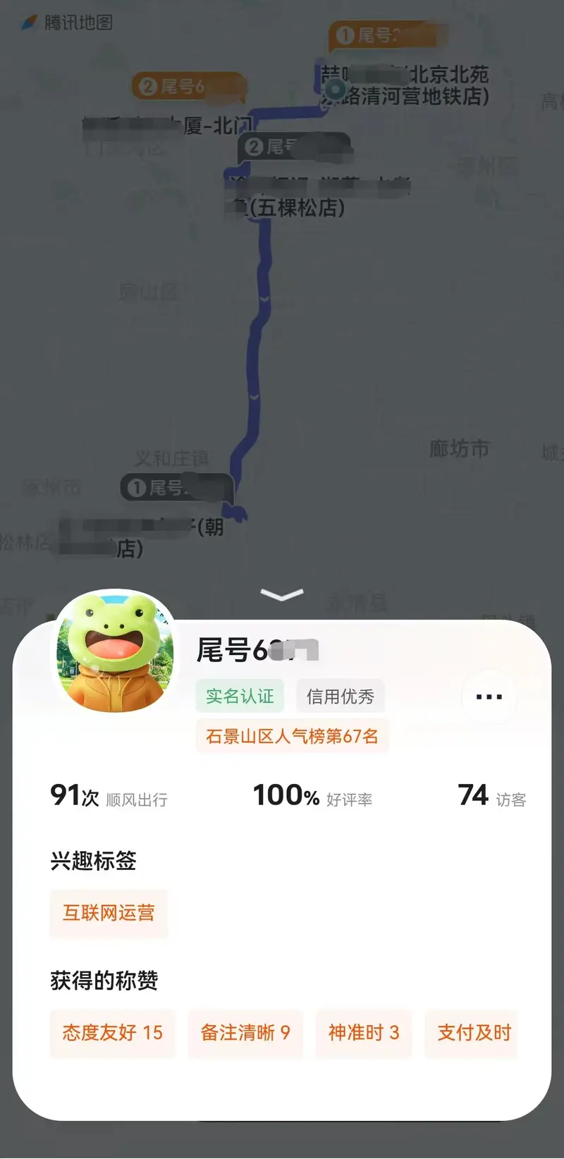 同时,用户个人主页针对同路人的外显信息,也基于增进互信友善这一目标进行拓展升级,包括头像、顺风榜单排名、兴趣标签、访客数、顺风出行次数、好评率、信用评级、获得的具体称赞等,这不仅有助于让用户选择合乘同路人时,获得更加丰富的信息参照,也能让合乘旅途更加轻松愉悦。