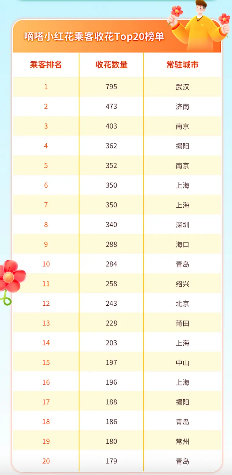 此外,嘀嗒出行近期基于顺风车大数据,还统计出了顺风车车主和乘客最爱送花城市榜单。其中,车主最爱送花城市前十依次是潍坊、韶关、青岛、廊坊、三亚、泰安、日照、东营、南通和抚顺;乘客最爱送花城市前十依次是三亚、青岛、河源、上海、大连、清远、