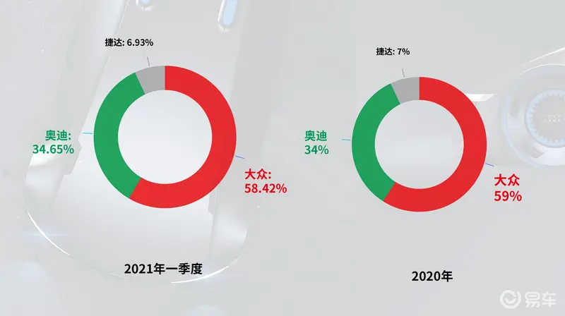 即使近年来奥迪的销量不断向上,但到去年年底及今年一季度时,双方在一汽-大众中的占比也基本维持在60%与35%左右。