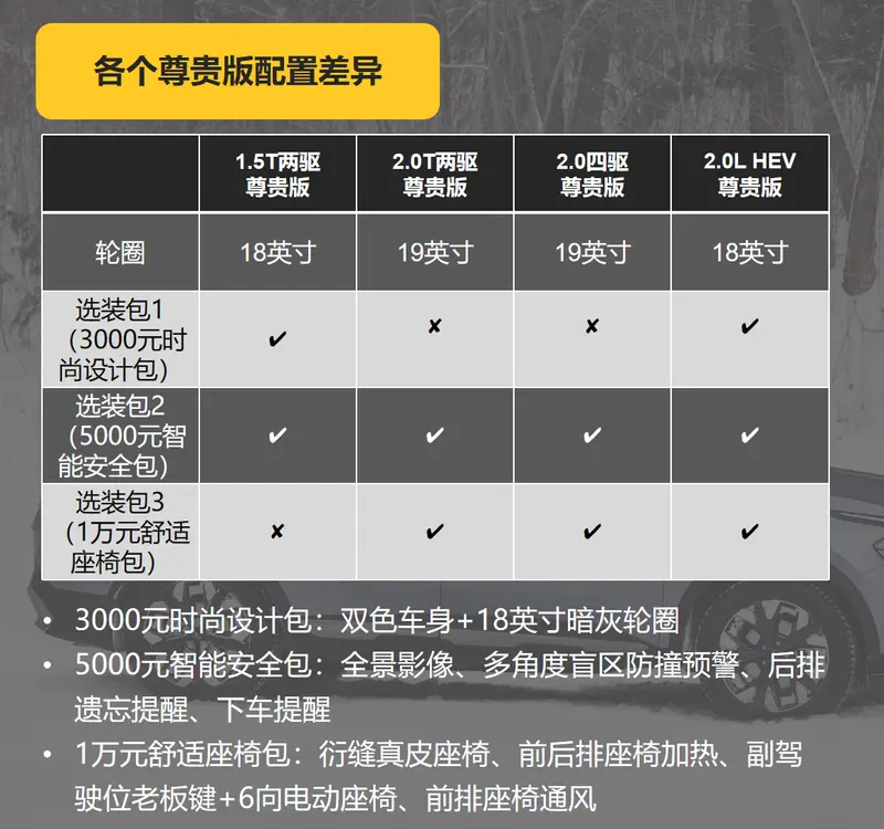 而尊贵版的四个版本分别有什么配置上的差异呢。从下表可以比较清楚看出,主要是可选择的选装包以及轮圈的差异。