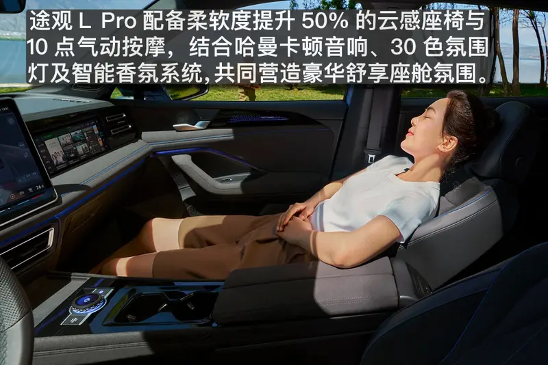 在驾乘舒适性上,云感舒享座椅的柔软度提升了50%,并配备10点气动按摩功能。12扬声器的哈曼卡顿音响、30色格调氛围灯以及首次搭载的智能香氛系统,共同将座舱的豪华与舒适体验提升到了新的高度。