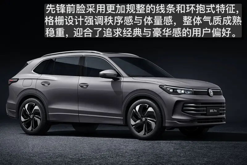 在造型上,途观L Pro 2026款成功地在经典德系稳健风格中,注入了前卫的科技元素与鲜明的个性色彩,实现了视觉上的全面进化。新车延续了备受好评的双前脸设计策略,先锋前脸采用更加规整的线条和环抱式特征,格栅设计强调秩序感与体量感,整体气质成熟稳重,迎合了追求经典与豪华感的用户偏好。