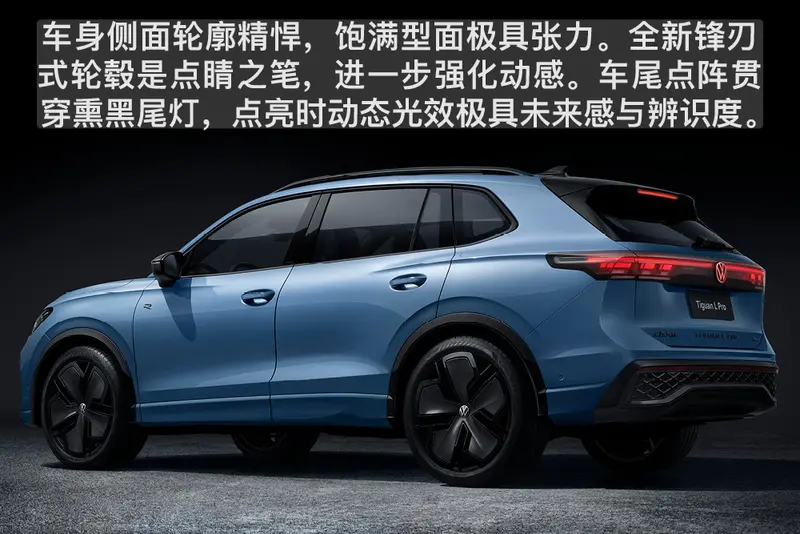 车身侧面,途观L Pro保留了经典、协调的SUV轮廓,但通过全新的轮圈设计提升了新鲜感。车尾的点阵式贯穿LED熏黑尾灯是另一大亮点,内部Surface LED造型元素有序排列,点亮后极具辨识度与层次感。