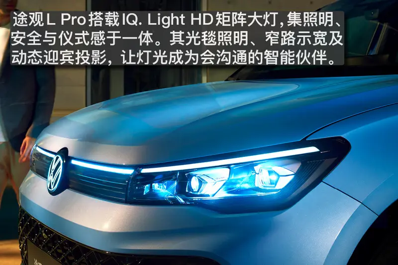 如果说双前脸定义了性格,那么灯光则赋予了它灵魂。途观L Pro搭载了同级唯一的 IQ. Light HD像素高清矩阵大灯。这套灯组单侧投影模组就集成了25,600颗LED灯珠,不仅是照明工具,更是智能交互载体。