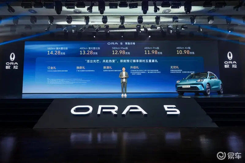 2025年11月12日开启预售至欧拉5上市开启订购前下订且支付成功,并于2025年12月31日24:00前完成购车并开具购车发票的用户可享受以下权益;订金礼,1000元订金抵扣3000元购车尾款;换新礼,厂家以旧换新补贴至高5000元;新潮礼,免费享价值3000元塞纳灰配色;升级礼,①免费享价值1000元18英寸四叶草低风阻轮毂、全系标配热泵空调基础上,额外赠送价值1200元;空调PTC辅热包;无忧礼,享辅助驾驶保障服务,至高500万级保障(仅限激光雷达版车型)。