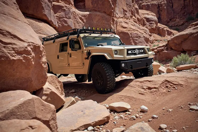 从外观上看,辅恒汽车旗下的景飞牌M50强汉仿佛是一位从战场上凯旋的勇士,散发着硬朗、坚毅的气息。其硬派设计风格搭配装甲灰配色,相得益彰,车身线条刚硬笔直,每一处转折都展现出力量感。整体造型简洁大方,没有过多繁琐的设计,一切都以实用和越野性能为出发点。车头部分,宽大的进气格栅搭配犀利的大灯组,不仅提升了车辆的辨识度,更彰显出其霸气的特质,仿佛在向世界宣告它征服一切路况的决心。
