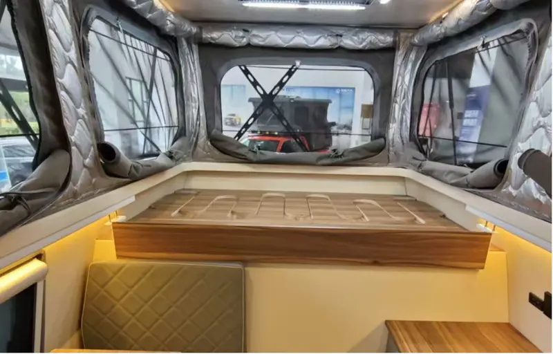 辅恒汽车的改装,真正实现了从工具车到“移动之家”的蜕变。车辆采用全铝合金箱体结构,兼具抗腐蚀、轻量化与高耐用性,兼顾油耗与操控表现。车顶的升顶帐篷展开后可达2.1米高度,让成年人在车内从容站立。四层拉链窗的设计,同时满足通风、遮阳、防水与防虫的需求,细节周到。