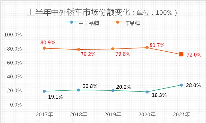 统计显示,1~6月本土轿车累计销量为130.32万辆,与2019年同期相比增长30.9%;上半年本土轿车占有率达到28.0%,与2019年同期相比大涨了7.8个百分点。
