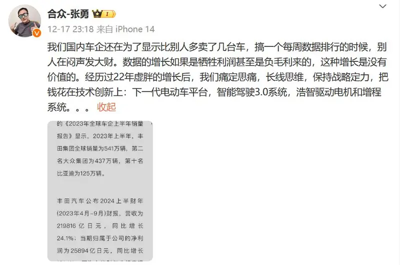 12月18日,哪吒汽车CEO张勇发布了一条微博,抨击大幅降价促销有可能会给车企带来更多亏损。