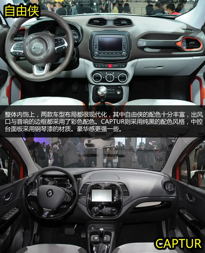 内饰方面Jeep自由侠继续了家族的粗矿风格,但在细节方面也做到了细致入微,而现代感的仪表盘绝对是个亮点。雷诺CAPTUR在内饰上也并不示弱,在表面的材料上体现了雷诺进口车型的细致各部位人性化设计也很多。