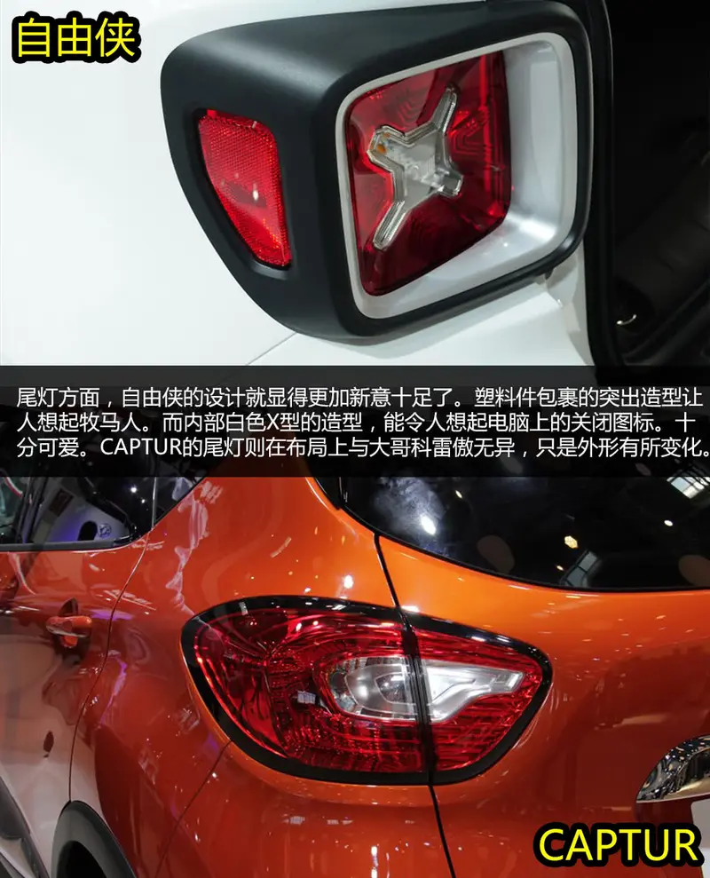 正如开篇时所说,两款车的外形走的是两种不同的风格。如果拟人一点说,那么自由侠正如可爱的小正太,在呆萌的外表下也有一个爷们的体魄,就如同动画电影《狮子王》中年幼的“辛巴"一般。而雷诺的CAPTUR则如一个灵动妩媚的少女一般,用流线型的车身演绎着时尚气息。