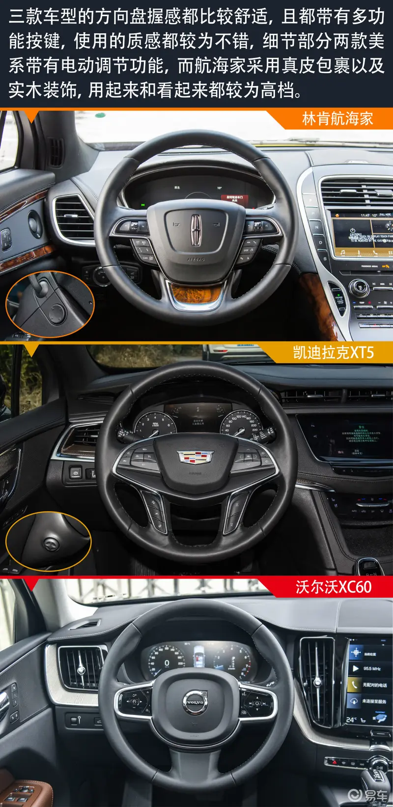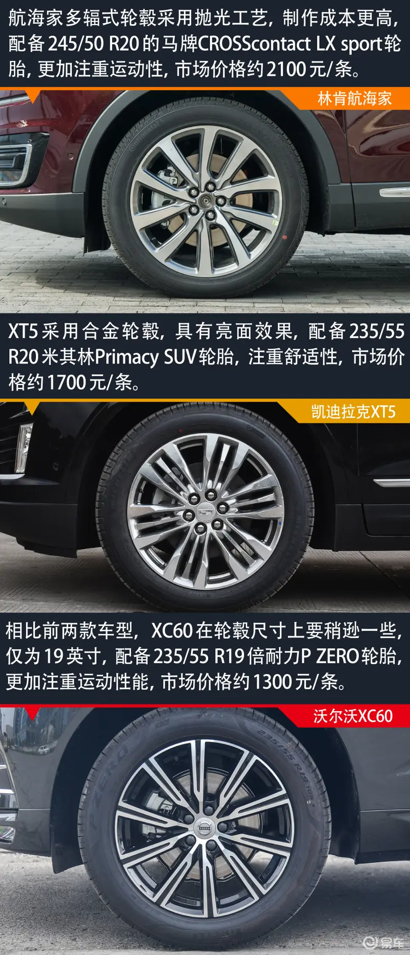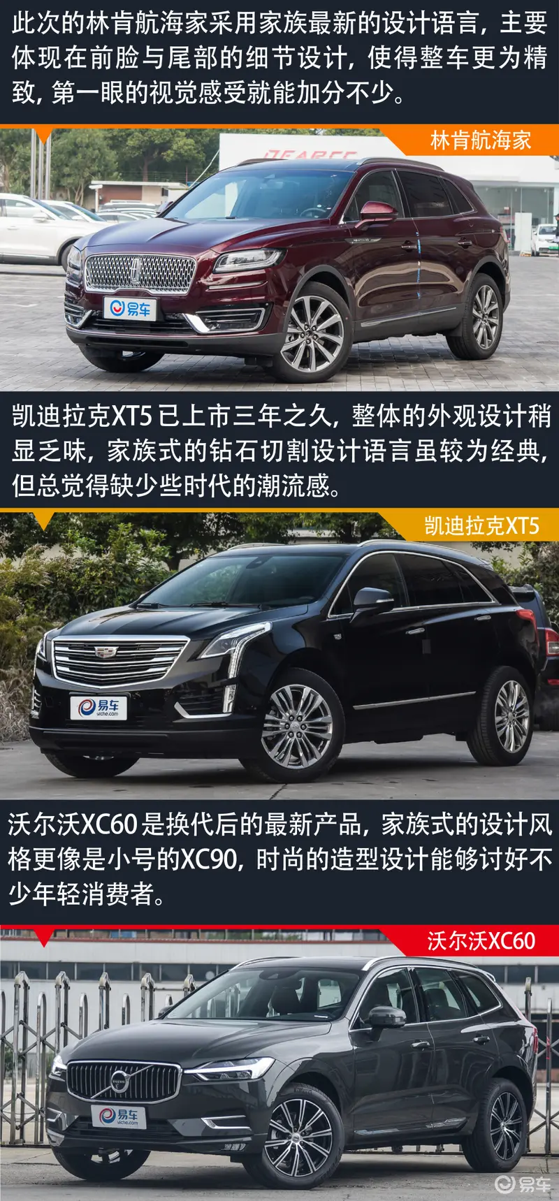 总结:纵观这个级别的车型来看,他们都有自己的特点,而今天的三款车型仿佛更加鲜明,林肯航海家的优势在于它有着中大型SUV的尺寸、丰富的安全科技性配置以及豪华舒适性,单纯这几点就能够吸引不少精英人群,凯迪拉克XT5则由于上市较早,在许多科技性配置上略显不足,不过较为不错的舒适性以及较大的优惠力度,也让这款车获得了不少人的青睐,至于沃尔沃XC60,运动化的外观、简约的内饰风格,以及安全性配置也能找到喜欢它的那一部分人群。
