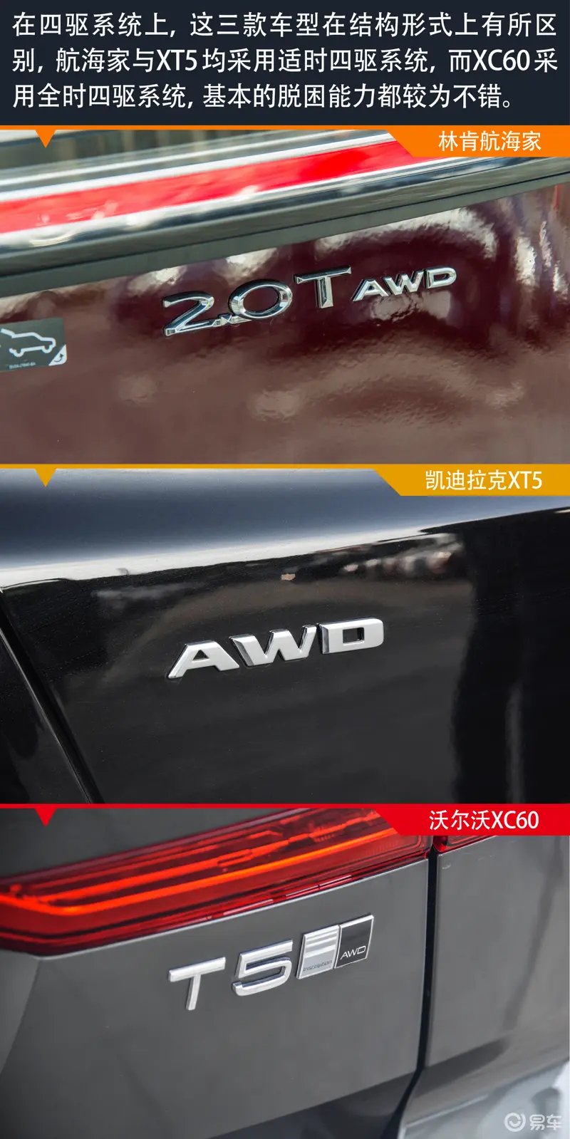 为了公平起见,我们本次选择的车型为航海家2.0T四驱尊雅版,XT5 28E四驱领先版,XC60 四驱智雅豪华版,售价分别是45.88万、47.99万、46.99万,价格十分接近。