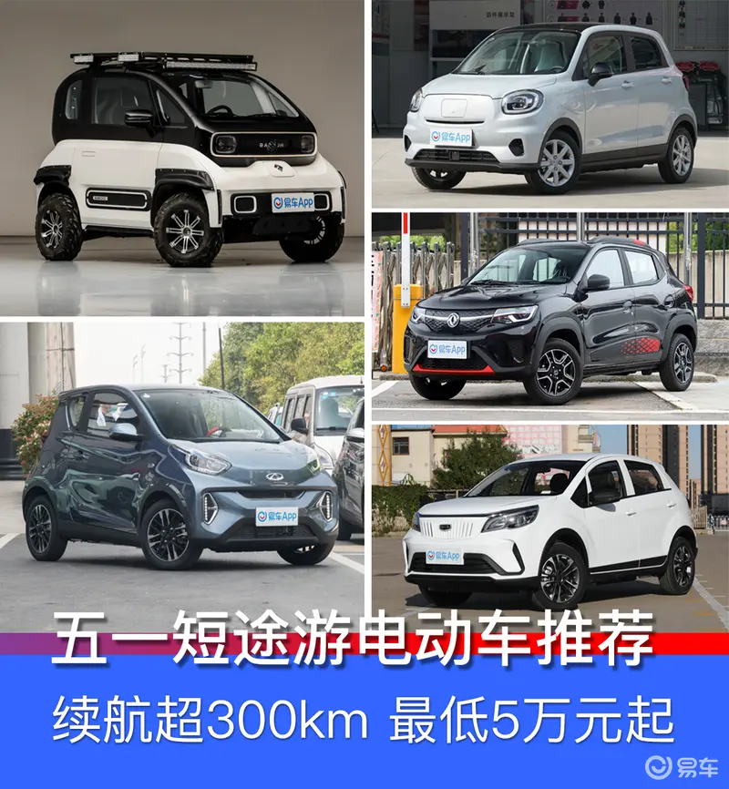 易车原创 每年五一小长假都是出游旺季,但今年的趋势与往年有所不同。有数据显示,今年五一小长假期间,消费者出游偏好呈现“三短”特征,即决策周期短、出游半径短、行程天数短,在地域分布上,北京、广州、南京、重庆、成都等一二线城市承载着本地及周边游客更显著的出游热情。毫无疑问,假期依然热闹,自驾车面对堵车、排队、抢停车位又将是一场激烈的PK,想要脱颖而出就要出奇制胜,所以首选的交通工具就是小型纯电动车,越堵越环保、停车还方便,这才是短途游的高端玩法。本文就给大家推荐五款续航超过300km的高性价比纯电动车,起步价最低不到5万元。