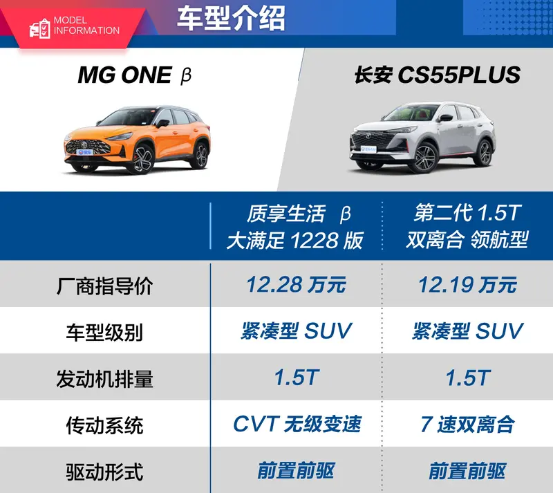 这两位主角分别是指导价12.28万元的2022款MG ONE 质享生活 1.5T CVT β 大满足1228版和指导价12.19万元的2022款长安CS55PLUS 第二代 1.5T 双离合 领航型。