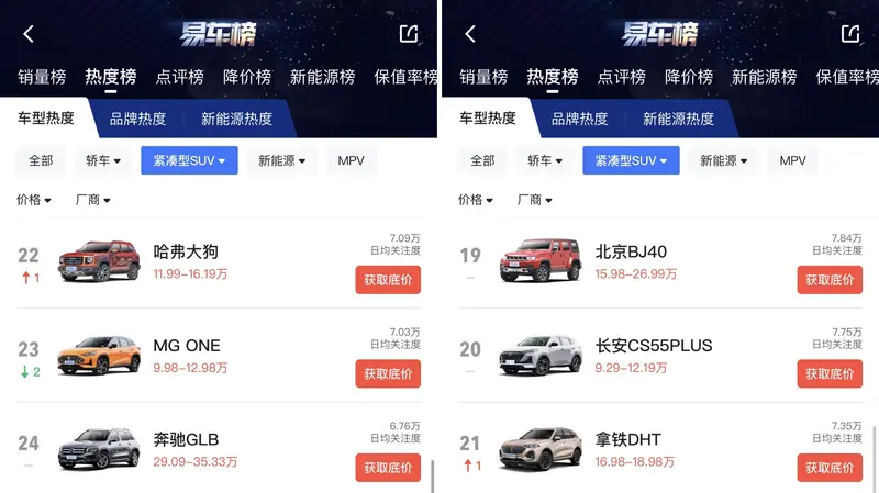 从易车热度榜单显示,MG ONE日均关注度7.03万,位居紧凑型SUV榜单排行第23名,而长安CS55PLUS日均关注度7.75万,排行第20名,更多数据请在易车APP里面查看。