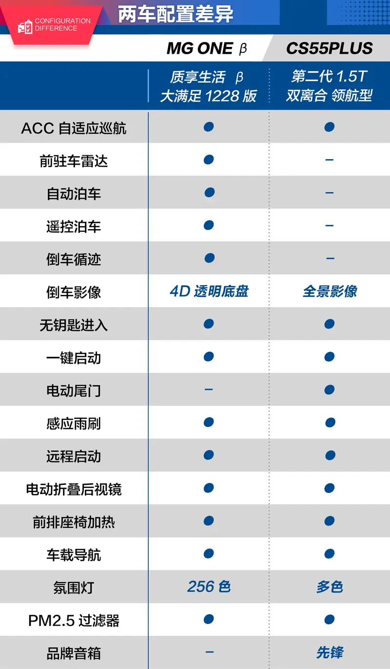 配置对比:MG ONE β舒适、安全面面俱到/CS55PLUS满足日常用车