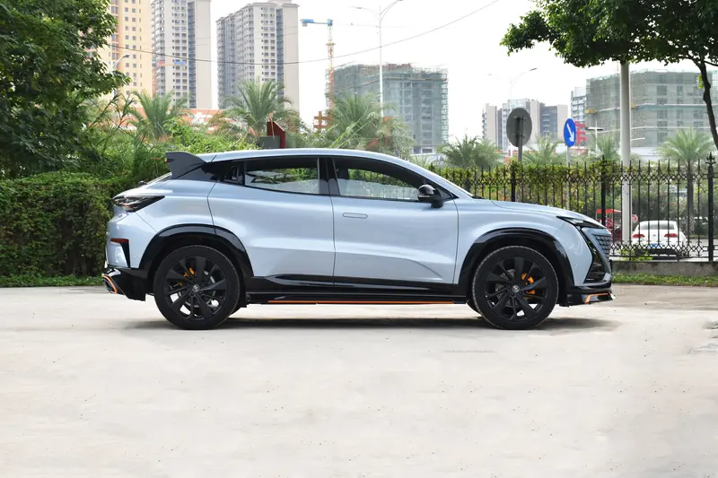长安UNI-T的车侧非常流线,跑味儿比一些运动家轿都要更足。隐藏式的门把手和悬浮式车顶看上去非常年轻,同时19英寸起步、多数车型配的20寸轮圈也带来极强的力量感。而在尾部,运动三件套:尾翼、扩散器和四出排气造型也是必备。
