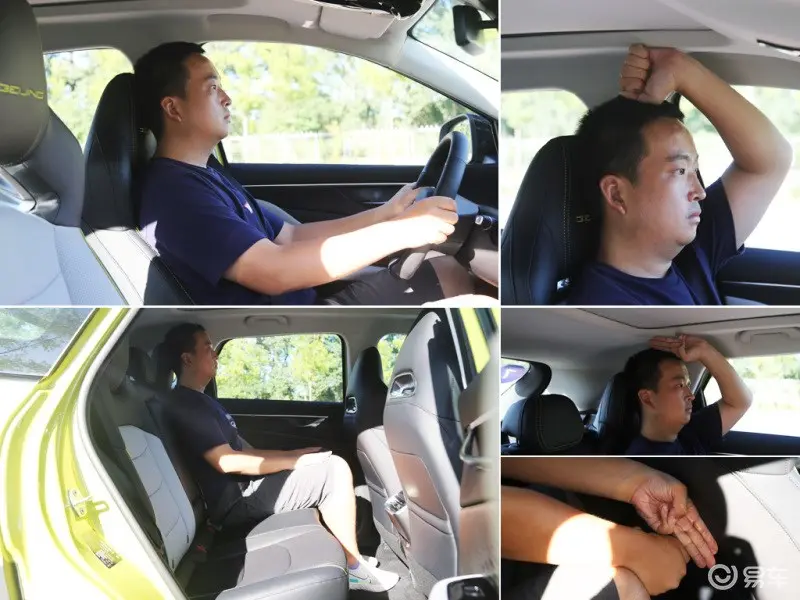 在空间实测部分,身高182cm的体验者进入车内,将前排座椅调至最低,靠背调至合适位置,头部空间剩余一拳。