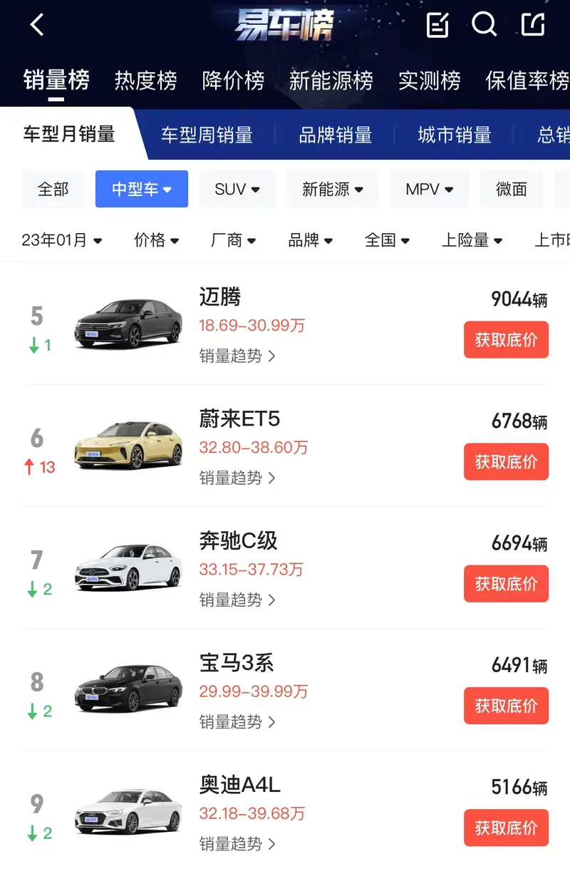 那么上图的销量究竟是否正确呢?我借助了易车App的销量查询功能,易车App的销量数据来源是乘联会,数据准确率还是比较高的。在1月中型车销量榜单中,ET5在上险量这一项数据中的确是超越了3系,ET5为6768辆,3系为6491辆,与上面那张图的数据相差无几。不过在零售量以及批发量方面,3系依然对ET5有着较大的优势。