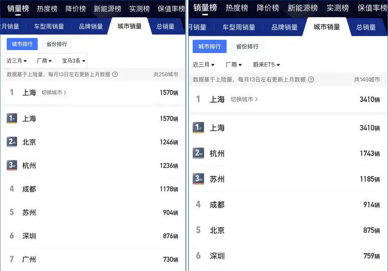 当然基于油车和电车不同的属性或者说市场接受程度而言,3系不仅畅销于一二线城市,对于三四线城市也有着很强的辐射能力。而ET5主要的销量来源还是一二线城市,特别是对新能源车接受度更高的城市。所以3系与ET5相比拥有更广泛的销量来源,所以如果只将市场锁定在一二线城市会如何呢?上图的来源我想应该大家都能一目了然,可以说在特定的时间段、特定的市场对比特定的车型,ET5的确可以说是存在一定的优势。