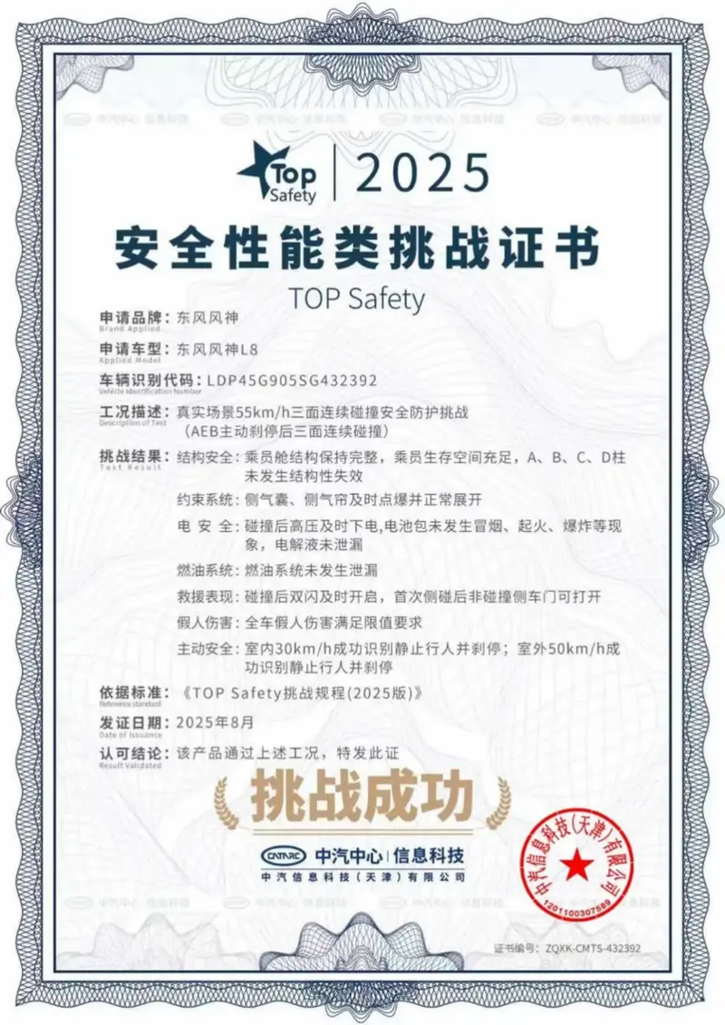 说到全家出行,其实安全尤为重要。因此值得一提的是,东风风神L8不久前通过行业首次的三面连续碰撞测试,ABC柱均无变形,用硬核数据证明了车身刚性,证明前后排得到全面的安全防护。
