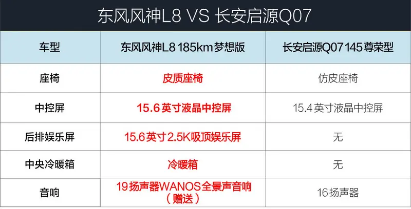 那么长安启源Q07与东风风神L8究竟有何差异?我们不妨同样以长安启源Q07 145尊荣型与东风风神L8 185KM理想版作为对比: