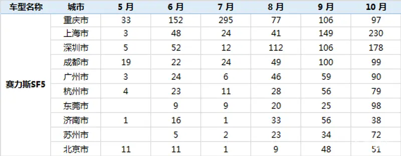 2021年5-10月赛力斯SF5各城市上险数