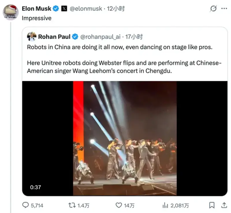 宇树G1机器人在模仿战斗动作时不慎给工程师"恶毒"一脚,他评论"笑哭"表情包;六台宇树人形机器人为王力宏演唱会伴舞,精准完成高难度"韦伯斯特空翻",他不仅转发至X平台更评价"令人印象深刻";小鹏IRON首秀视频中拟人化走姿引发关注,他点赞并直言"特斯拉与中国公司将主导市场"。
