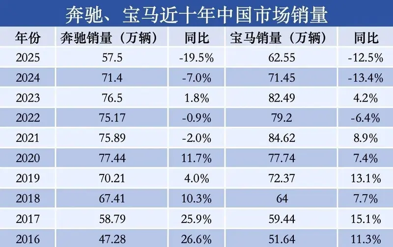 但如今,情况截然不同。2025年,奔驰在华销量55.19万辆,同比下滑19%;宝马62.55万辆,同比下滑12.5%。这是两家公司销量连续第二年下跌。