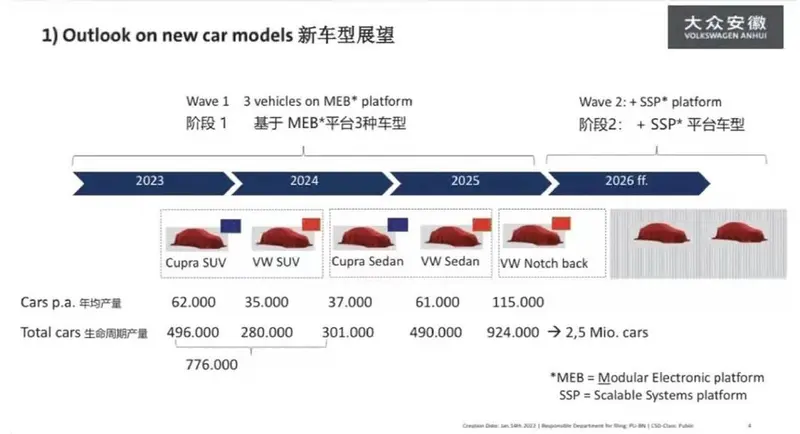 大众安徽聚焦新能源汽车的研发与生产,将基于集团的MEB模块化电驱动平台打造纯电动汽车。大众安徽MEB工厂将于2022年中整体落成,首款新能源车型将于2023年下半年量产投产。