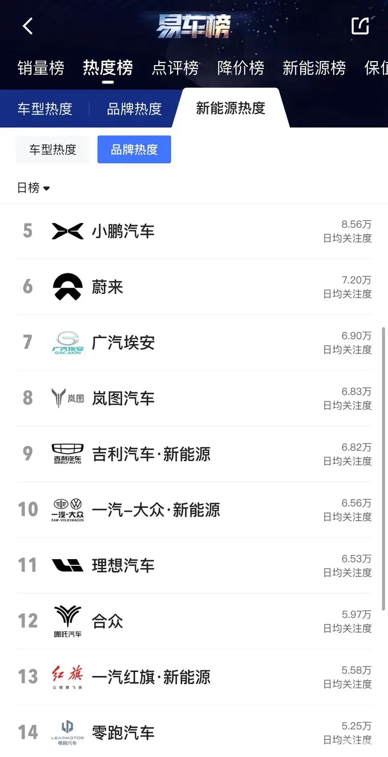 根据易车App“热度榜”数据,蔚来的日均关注度为7.20万,在全部新能源品牌中排名第6位,如需更多数据,请到易车App查看。