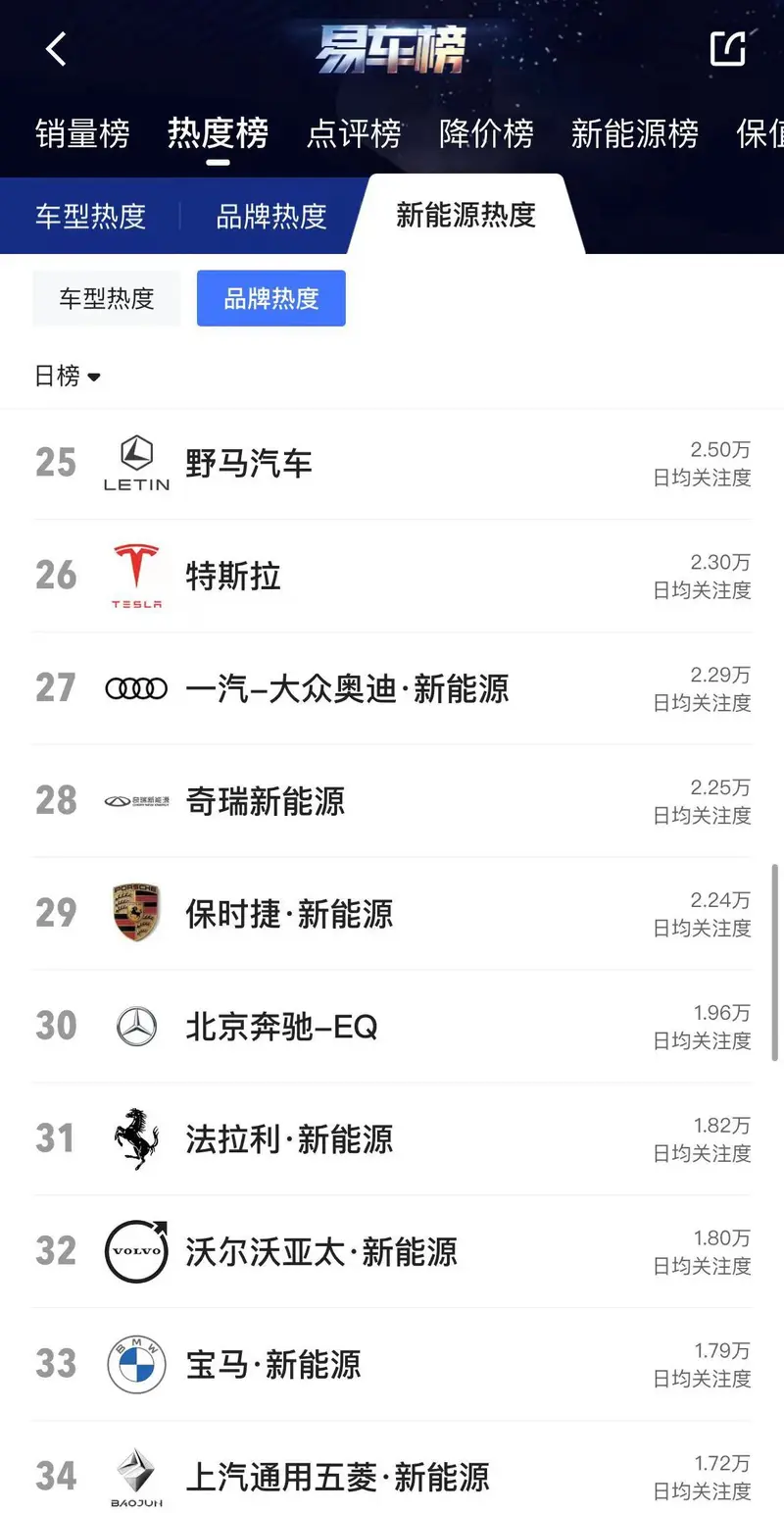 根据易车App“热度榜”数据,特斯拉的日均关注度为2.30万,在全部新能源品牌中排名第26位,如需更多数据,请到易车App查看。
